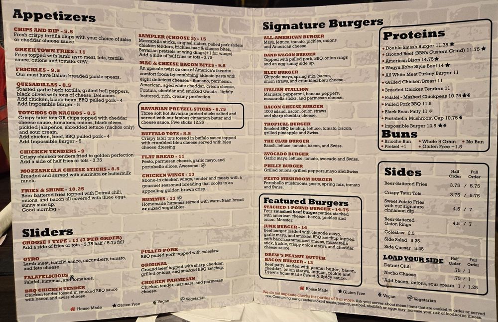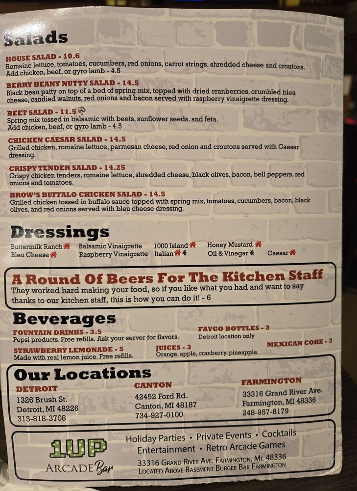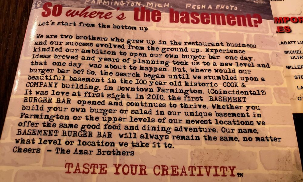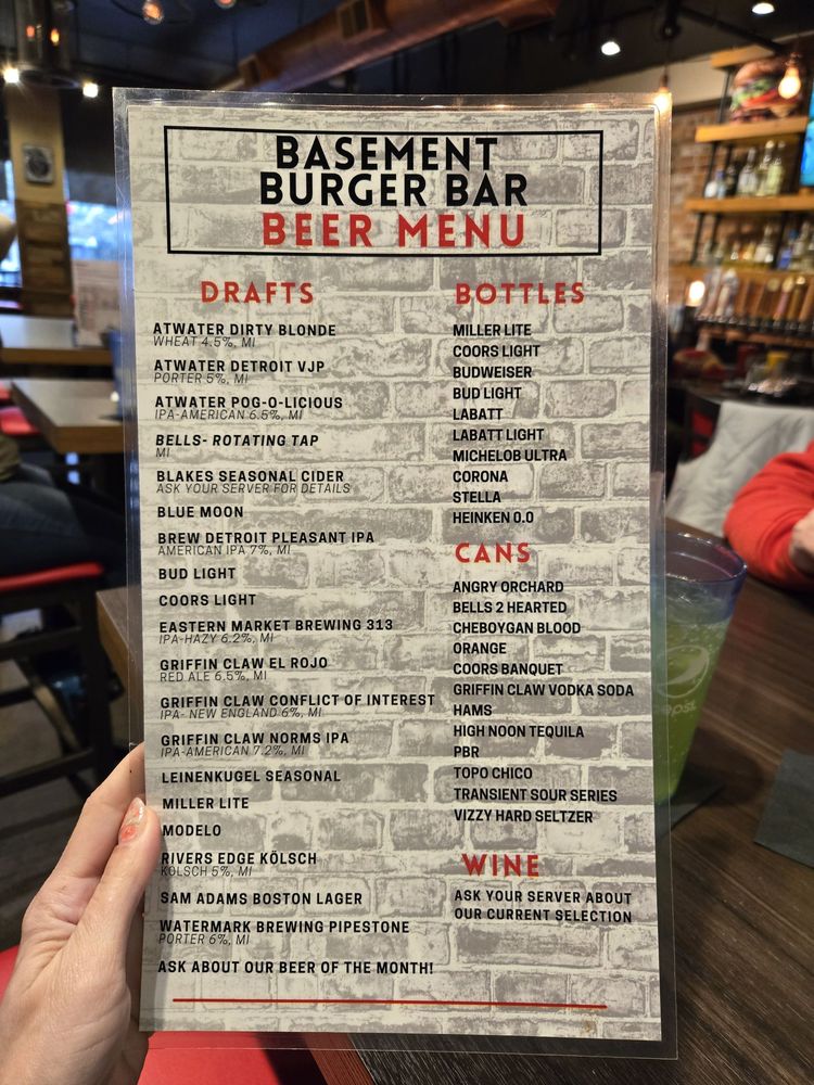 Basement Burger Bar, located in Farmington, MI, offers a casual dining experience with a wide range of options including vegan choices and customizable burgers. The menu features delectable starters like Greektown Fries and Frickles, as well as hearty salads such as Chicken Caesar and Beet Salad. Customers rave about the friendly staff, cozy atmosphere, and the ability to create their own perfect burger. Reviews highlight the crispy fries, perfectly cooked burgers, and delicious beer selection. With options for large groups and a full bar, Basement Burger Bar is the go-to spot for a fun and satisfying meal.